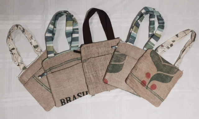 This double-strapped burlap bag makes a great catch all when you are on the go! Made from recycled rice sacks in Haiti, the money goes to help women in need!